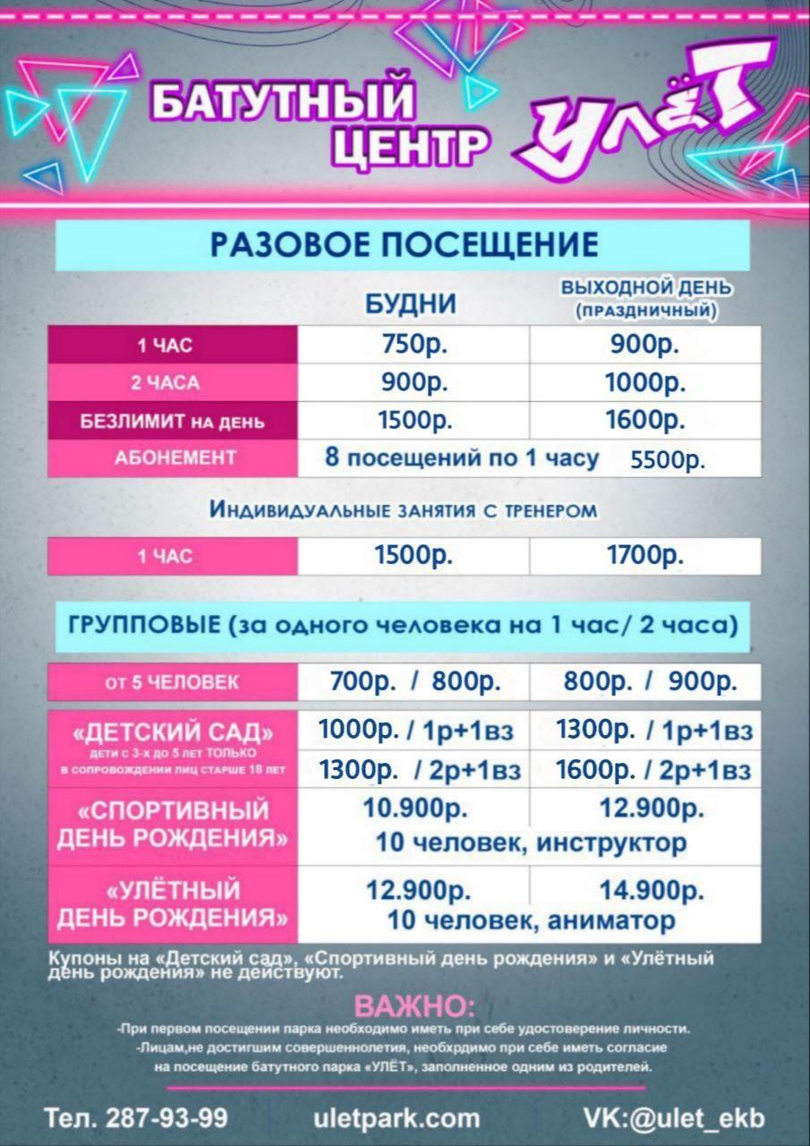 Обязательно: • Заниматься в спортивной удобной одежде, чешках или плотных носках. Спортивная одежда должна быть без элементов, которые могут мешать заниматься: молнии, пуговицы, застежки, жесткие элементы, широкие карманы, выступающие детали и пр. • Полностью выложить все из карманов во избежание травм и потери личных вещей. Снять с себя часы, цепочки, пирсинг, крестики, длинные серьги и т.п. • Сделать разминку и разогреть мышцы в начале занятия и завершающие упражнения - в конце. • При прыжке в поролоновую яму убедиться, что в ней никого нет. • Обращаться к инструктору, в случае если Вы хотите разучить новый элемент или трюк, в том числе на батуте или акробатической дорожке. • Предупреждать инструктора о прошлых травмах или нарушениях здоровья, а так же о любом ухудшении самочувствия во время занятия. • Совершать действия, находящиеся в рамках Ваших навыков и физических возможностей! • Помните, что необдуманные действия могут привести к травмам и неудобству окружающих! • Бережно относиться к оборудованию и помещению зала. • Соблюдать тишину в зале, уважать и не отвлекать других занимающихся спортсменов. • Лицам, не достигшим 18 лет, иметь при себе разрешение от родителей! • Следить родителям за детьми до и после занятия. • В зале находиться без обуви (в носках или чешках). • Инструктор имеет право вывести со спортивного снаряда ребенка или взрослого во время занятия* за невыполнение вышеупомянутых правил и любых его инструкций!!!